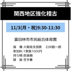 強化稽古の予定 【11/3】関西地区強化稽古(富田林) 日程:11月3日(月・文化の日)9:30-11:30 場所:富田林市立スポーツ施設(市民総合体育館)柔道場 指導:大阪南支部 臼井創一郎支部長 参加料:1家族1000円(当日お支払い下さい) 持ち物:防具類(ヘッドガード、チェストサポーター... 2025.10.20 強化稽古の予定