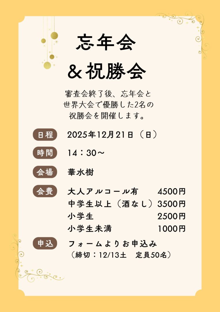 12/21(日)の審査会・練習試合終了後に忘年会と世界大会で優勝した木下陽葵ちゃんと長水龍斗くんの祝勝会を行います。