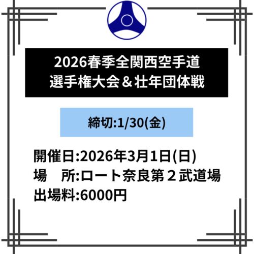 【3/1】2026春季全関西空手道選手権大会&壮年団体戦(締切1/30) 大会案内 2025.12.12 2026年3月1日(日)ロート奈良第2武道場で「2026極真館春季全関西空手道選手権大会&壮年団体戦」が開催されます。 出場希望者は要項をよく読んで締切日までに申込書と出場料を提出して下さい。 →極真館全関西大会ホームページ 共有: クリックして X で共有 (新しいウィンドウで開きます) X Facebook で共有するにはクリックしてください (新しいウィンドウで開きます) Facebook いいね:いいね 読み込み中… 関連