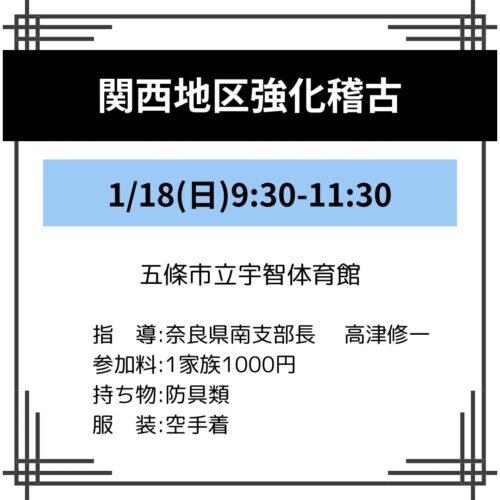 【1/18】関西地区強化稽古(五條) 強化稽古の予定 2026.01.12 日程:1月18日(日)9:30-11:30 場所:五條市立宇智体育館 指導:奈良県南支部 高津修一支部長 参加料:1家族1000円(当日お支払い下さい) 持ち物:防具類(ヘッドガード、チェストサポーターも) ※希望者にはヘッドガードを貸し出しますので前以て申し出て下さい。 共有: クリックして X で共有 (新しいウィンドウで開きます) X Facebook で共有するにはクリックしてください (新しいウィンドウで開きます) Facebook いいね:いいね 読み込み中… 関連