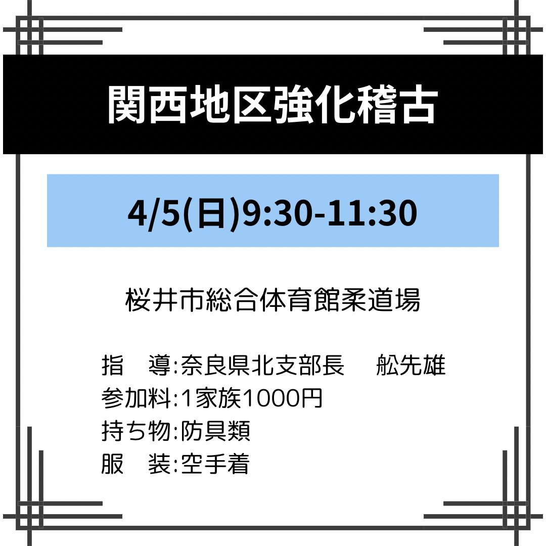 【4/5】関西地区強化稽古(桜井) 強化稽古の予定 2026.02.01 日程:4月5日(日)9:30-11:30 場所:桜井市総合体育館 柔道場 指導:奈良県北支部 舩先雄支部長 参加料:1家族1000円(当日お支払い下さい) 持ち物:防具類(ヘッドガード、チェストサポーターも) ※希望者にはヘッドガードを貸し出しますので前以て申し出て下さい。 共有: クリックして X で共有 (新しいウィンドウで開きます) X Facebook で共有するにはクリックしてください (新しいウィンドウで開きます) Facebook いいね:いいね 読み込み中… 関連