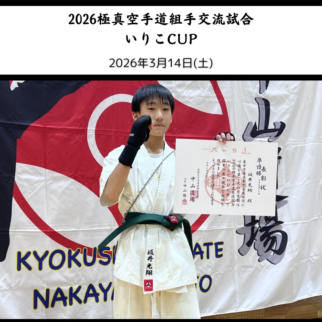 2026極真空手道「組手」交流試合・いりこCUP(2026/3/14土) 大会結果 2026.03.14 本日、香川県の善通寺市民体育館で開催された極真空手中山道場様主催の「2026極真空手道組手交流試合・いりこCUP」で大淀道場の坂井光翔くんが準優勝(中学生男子)しました。 おめでとう! 共有: X で共有 (新しいウィンドウで開きます) X Facebook で共有 (新しいウィンドウで開きます) Facebook いいね:いいね 読み込み中… 関連