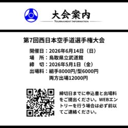 2026年6月14日(日)、鳥取県立武道館で「第7回西日本空手道選手権大会」が開催されます。 出場希望者は案内をよく読んで、締切日までに申込書と出場料を提出して下さい。 WEBエントリーも可能ですが、WEBエントリーを行う場合は必ず前もって...